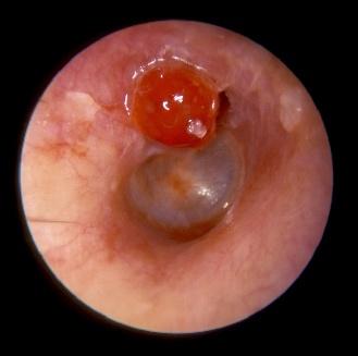 4、耳镜检查:初始鼓膜松弛部充血,锤骨柄及紧张部周边可见放射状扩张血管;继之鼓膜呈弥漫性充血,伴肿胀,向外膨隆如乳头状,其中心有黄点。